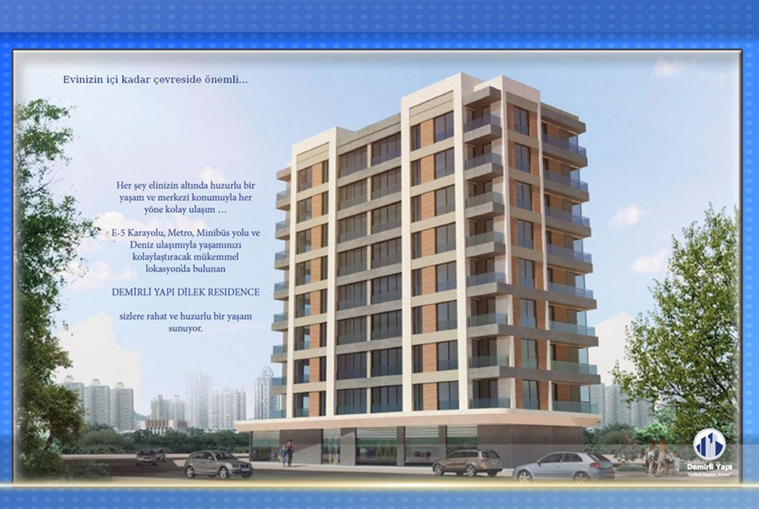 Genel Bilgi Konum Fırsatlar 1512 m2 araz üzerinde Z+8 kat toplam 15 konut ve 5 ticari alandan oluşuyor. E-5 karayolu,metro,minibüs yolu ve deniz ulaşımına yakınlığıyla dikkat çekiyor. İster Banka kredisiyle 60 veya 120 ay vade, isterseniz kişiye özel ödeme planı senekleriyle %0 faiz 18 ay taksit seçenekleriyle.